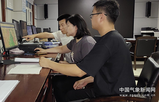 7月5日晚,山東省淄博市周村區氣象局全體業務人員密切監視天氣變化,呂翰林(右一)與同事全力做好氣象服務保障工作。王先蕓 攝影