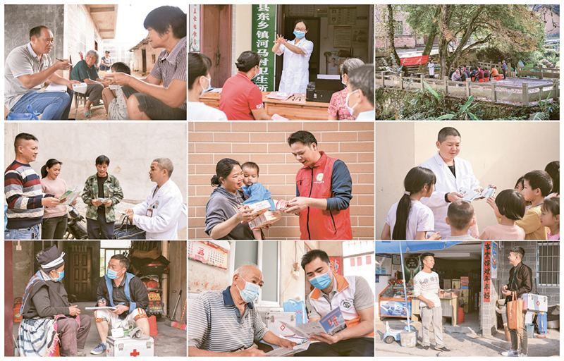 2024年8月19日是第七個中國醫師節。讓更多群眾能在“家門口”看病,是深化醫藥衛生體制改革的重要目標。最新數據顯示,我國有495萬名基層衛生健康工作者,其中有110萬名鄉村醫生,發揮著“健康守門人”的重要作用。這張拼版照片顯示的是鄉村醫生們在出診中開展健康咨詢及知識宣傳工作。 新華社記者 曹祎銘/攝