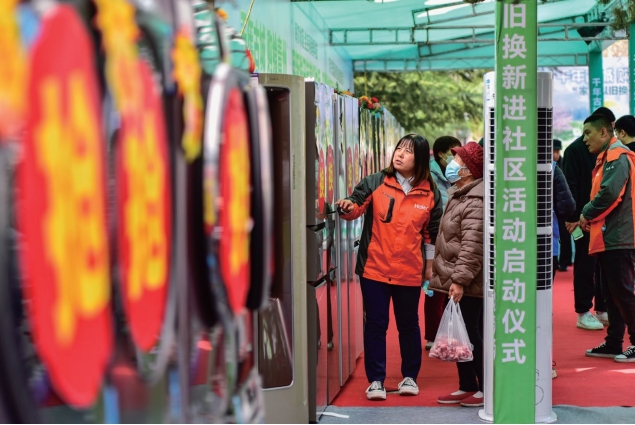 >> 2024年3月16日,在山東省青州市舉辦的家電以舊換新進社區活動現場,消費者在選購家電。