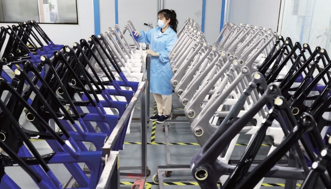 >> 國家統計局發布的數據顯示,經初步核算,2024年上半年國內生產總值(GDP)為616836億元,按不變價格計算,同比增長5.0%,上半年國民經濟延續恢復向好態勢,運行總體平穩、穩中有進。圖為2024年7月15日,江蘇連云港經濟技術開發區工人在碳纖維自行車生產線上忙碌。