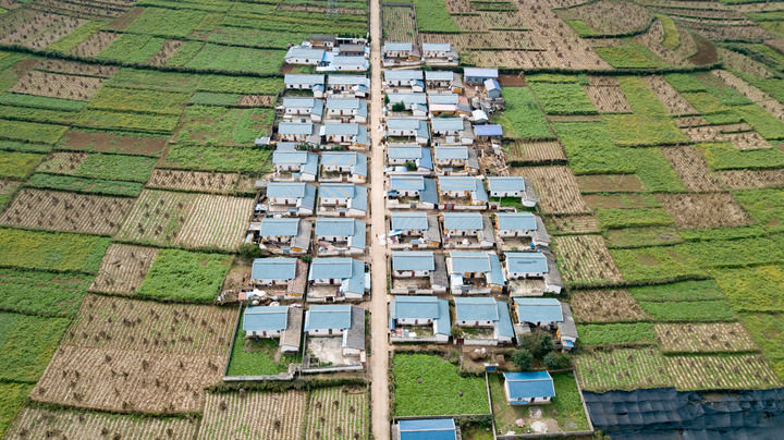 俯瞰四川省昭覺縣地莫鄉地莫村田園中的新居(2020年10月10日攝,無人機照片)。新華社記者 張笑宇 攝