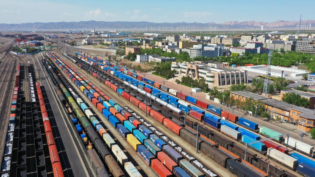 2024年5月25日,在新疆阿拉山口站寬準(zhǔn)軌編組場(chǎng),出入境中歐班列集結(jié)等待出發(fā)(無人機(jī)照片)。新華社發(fā)(于暉 攝)