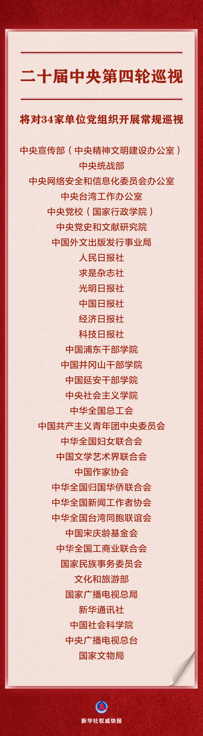 新華社北京10月29日電 經黨中央批準,二十屆中央第四輪巡視將對中央宣傳部(中央精神文明建設辦公室)、中央統戰部、中央網絡安全和信息化委員會辦公室、中央臺灣工作辦公室、中央黨校(國家行政學院)、中央黨史和文獻研究院、中國外文出版發行事業局、人民日報社、求是雜志社、光明日報社、中國日報社、經濟日報社、科技日報社、中國浦東干部學院、中國井岡山干部學院、中國延安干部學院、中央社會主義學院、中華全國總工會、中國共產主義青年團中央委員會、中華全國婦女聯合會、中國文學藝術界聯合會、中國作家協會、中華全國歸國華僑聯合會、中華全國新聞工作者協會、中華全國臺灣同胞聯誼會、中國宋慶齡基金會、中華全國工商業聯合會、國家民族事務委員會、文化和旅游部、國家廣播電視總局、新華通訊社、中國社會科學院、中央廣播電視總臺、國家文物局等34家單位黨組織開展常規巡視。