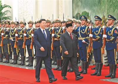 天安門廣場鳴放21響禮炮,禮兵列隊致敬。兩國元首登上檢閱臺,軍樂團奏中印尼兩國國歌。普拉博沃在習(xí)近平陪同下檢閱中國人民解放軍儀仗隊,并觀看分列式。