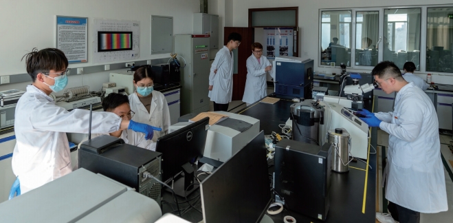 >> 2024年5月,中國科學院新疆理化技術(shù)研究所光電功能晶體材料創(chuàng)新團隊成員在實驗室做研究。