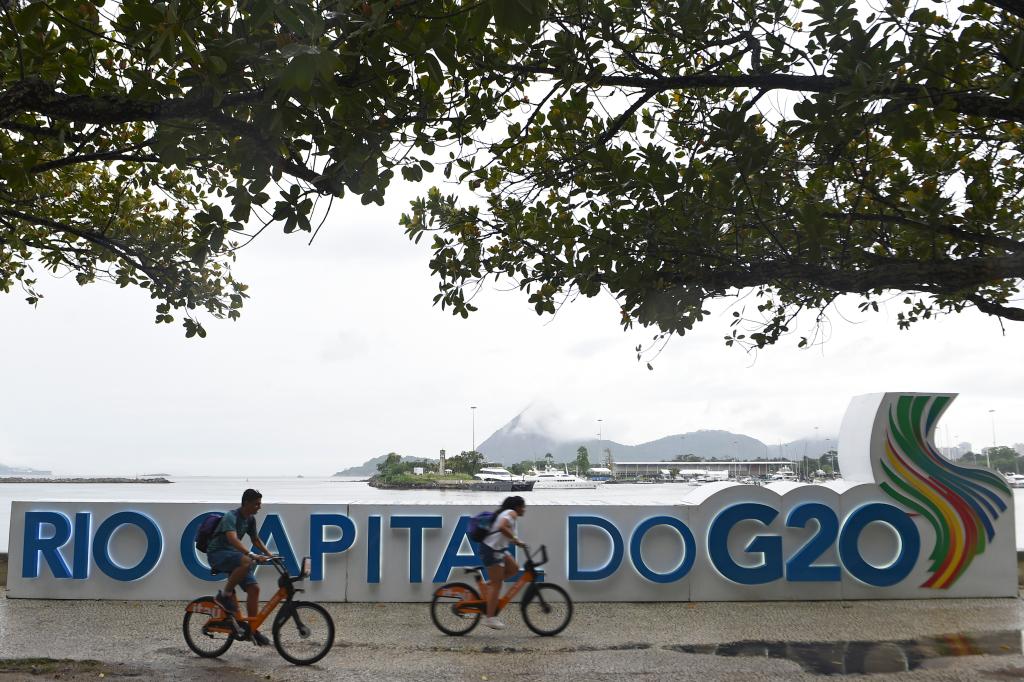 11月16日,在巴西里約熱內盧,人們騎車經過二十國集團領導人峰會舉辦地附近的峰會標識。新華社發(盧西奧·塔沃拉攝)
