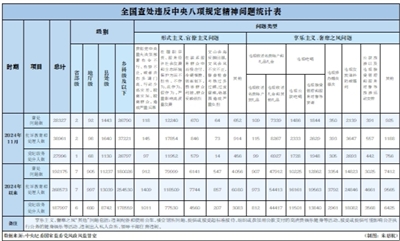 12月25日,中央紀委國家監委公布了2024年11月全國查處違反中央八項規定精神問題匯總情況。當月,全國共查處違反中央八項規定精神問題28327起,批評教育和處理38961人,其中黨紀政務處分27996人,這是連續第135個月公布月報數據。