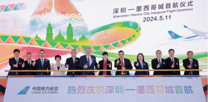 2024年5月11日深夜,墨西哥城貝尼托·華雷斯國際機(jī)場迎來闊別4年的“遠(yuǎn)客”——一架橫跨太平洋抵達(dá)墨西哥的中國民航客機(jī)。為了給中國客人接風(fēng)洗塵,當(dāng)?shù)貦C(jī)場工作人員精心準(zhǔn)備了過水門的最高禮儀。該航線從深圳起飛,不經(jīng)停直達(dá)墨西哥城,全程飛行1.4萬余公里。中墨客運(yùn)直航順利開通,標(biāo)志著疫情后我國與拉丁美洲和加勒比地區(qū)之間首條不經(jīng)停客運(yùn)航線正式恢復(fù),高效落實(shí)了兩國元首舊金山會晤重要共識,成為2024年對拉外交工作的亮點(diǎn)工程、便利雙方人員往來的民心工程、服務(wù)高質(zhì)量發(fā)展的開放工程。目前,墨西哥成為從我國出發(fā)的民航客運(yùn)航班可以直飛到達(dá)的最遠(yuǎn)國家。
