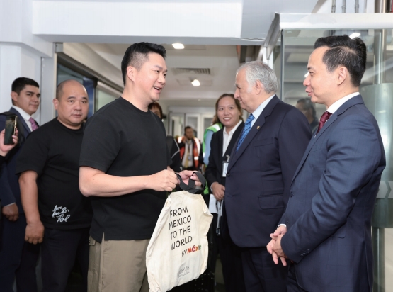 >> 2024年5月11日,時任駐墨西哥大使張潤(右一)向乘坐中墨直航航班抵墨乘客贈送紀(jì)念品及領(lǐng)事保護(hù)手冊。
