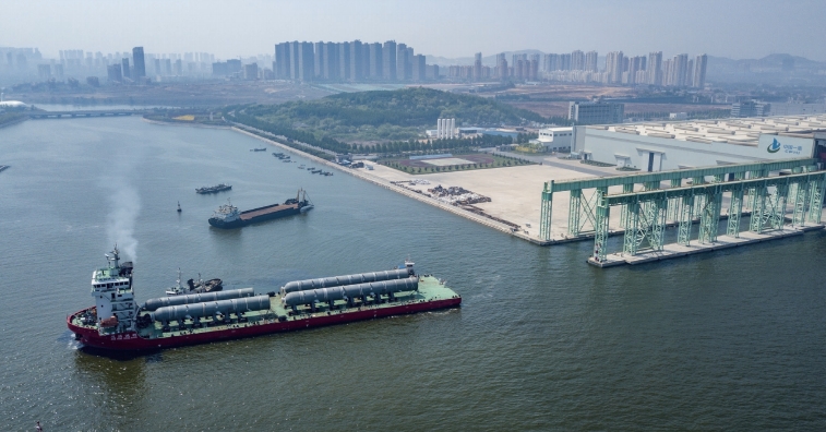 >> 中國一重已成功交付各類容器1400余臺、千噸級以上反應器100余臺,逐步成長為全球煉油、化工領域核心裝備最大的供應商和制造技術的領先者。圖為中國一重承制的新加坡煉化一體化(CRISP)工程項目加氫容器發運。