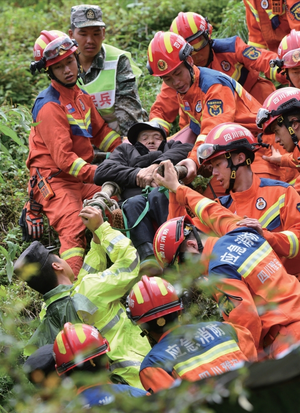 “沒有路,我們就是路”——2024年7月21日,四川省雅安市漢源縣發生山洪泥石流災害,現場溝深坡陡,道路損毀嚴重,雅安消防救援支隊接力轉運行動不便的老人。
