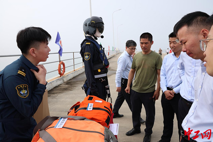 交通運輸部東海第二救助飛行隊救生員葉佳豪向群眾展示海上救生設備。交通運輸部救助打撈局 供圖