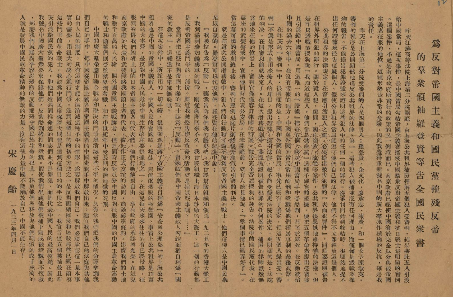 1933年4月1日,宋慶齡發表《為反對帝國主義和國民黨摧殘反帝的群眾領袖羅登賢等告全國民眾書》