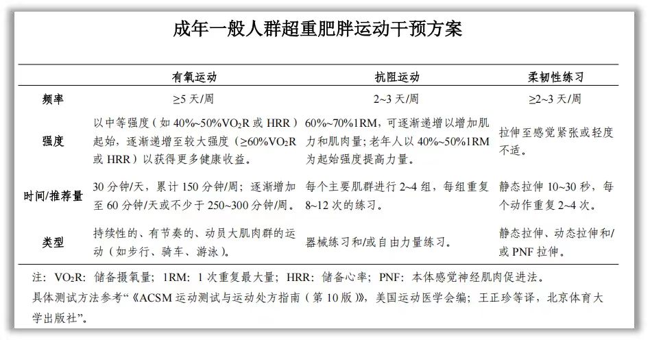 (1)一般人群的運(yùn)動(dòng)干預(yù)。進(jìn)行有氧運(yùn)動(dòng)干預(yù)時(shí),建議由小運(yùn)動(dòng)量開(kāi)始,逐漸達(dá)到30分鐘/天的中等至較大強(qiáng)度。對(duì)于運(yùn)動(dòng)依從性較差的個(gè)體,可以通過(guò)累計(jì)多次、每次不少于10分鐘的連續(xù)運(yùn)動(dòng)達(dá)到總的運(yùn)動(dòng)量。為了實(shí)現(xiàn)長(zhǎng)期控制體重的效果,建議應(yīng)逐漸達(dá)到至少250分鐘/周(或消耗≥2000千卡/周)中等至較大強(qiáng)度運(yùn)動(dòng),且將運(yùn)動(dòng)分在每周的5-7天內(nèi)進(jìn)行。可根據(jù)年齡、健康狀況和運(yùn)動(dòng)能力采用不同的運(yùn)動(dòng)方法進(jìn)行運(yùn)動(dòng)干預(yù)。
