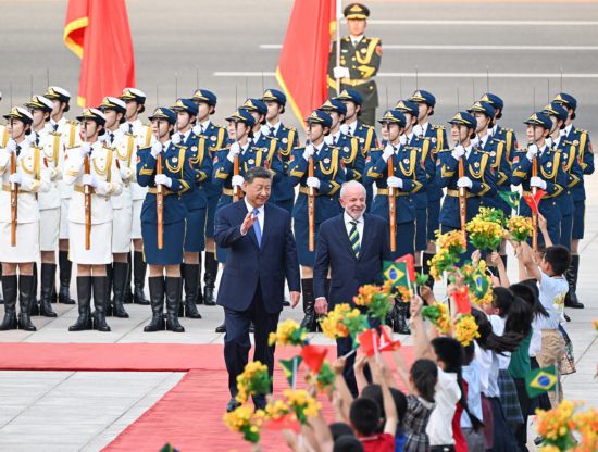 5月13日下午,國(guó)家主席習(xí)近平在北京人民大會(huì)堂同來(lái)華進(jìn)行國(guó)事訪問(wèn)的巴西總統(tǒng)盧拉舉行會(huì)談。這是會(huì)談前,習(xí)近平在人民大會(huì)堂東門(mén)外廣場(chǎng)為盧拉舉行歡迎儀式。新華社記者 饒愛(ài)民 攝