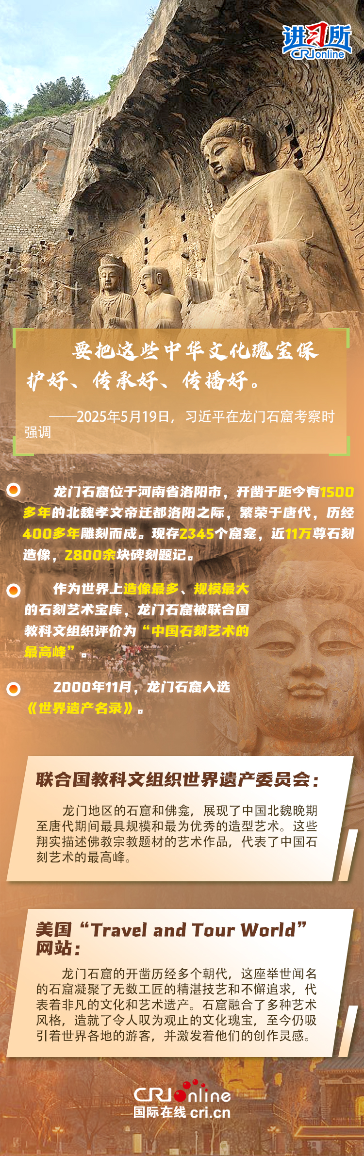 近日,中共中央總書記、國家主席習近平在河南洛陽考察調研。在龍門石窟,他察看石窟整體布局風貌和代表性窟龕、造像,叮囑現場的文物保護工作者要把這些中華文化瑰寶保護好、傳承好、傳播好。