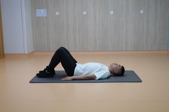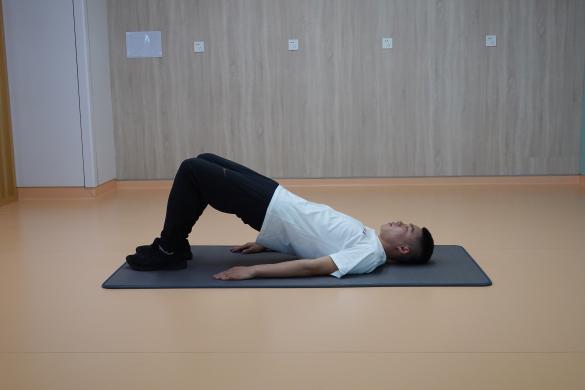 3、仰臥橋式挺臀:仰臥位屈膝,雙腳著地,腹部收緊,臀部夾緊抬起,使肩、髖、膝處于同一直線上,從側面看大腿小腿呈90度。一組進行10-15次,重復2-4組,組間休息60秒。