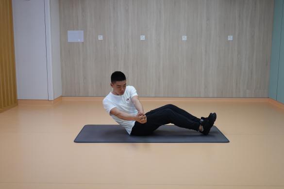 4、俄羅斯扭轉:臀部和腳跟支撐身體,雙手在身前合攏,腹部核心發力,軀干向左右扭轉,左右交替為1次,一組進行10-15次,重復2-4組,組間休息60秒。