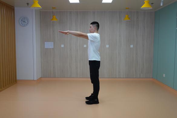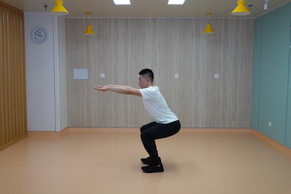 5、蹲起:站立位,雙腳分開與肩同寬,腰背挺直,膝蓋與腳尖方向一致,手臂前平舉,掌心向下,向下下蹲,隨后起身還原。一組進行10-15次,重復2-4組,組間休息60秒。