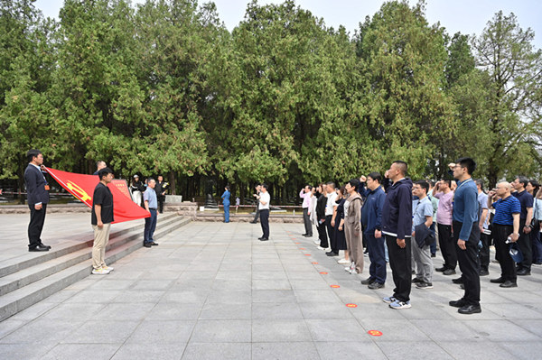5月13日下午,參訓同志在孟良崮烈士陵園中的英烈亭前舉行重溫入黨誓詞活動。新華社攝影部宋為偉攝。