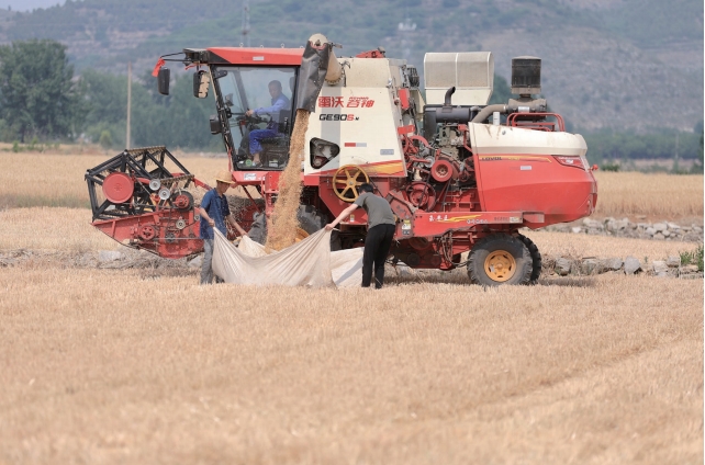 2024年5月19日,在山東省棗莊市山亭區鳧城鎮,當地農民抓住天氣晴朗的有利時機,聯系農機手駕駛收割機加緊收割小麥,確保顆粒歸倉。