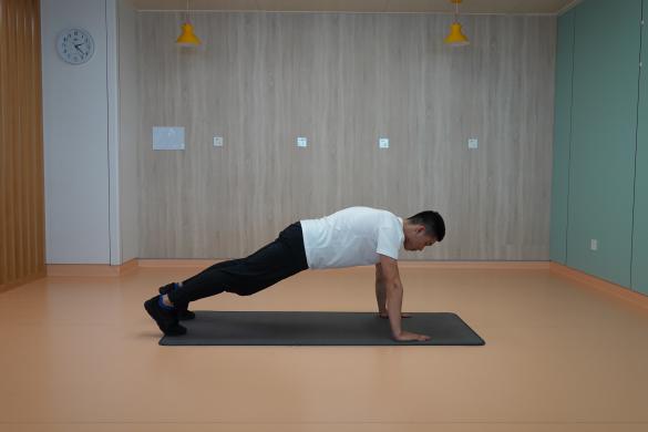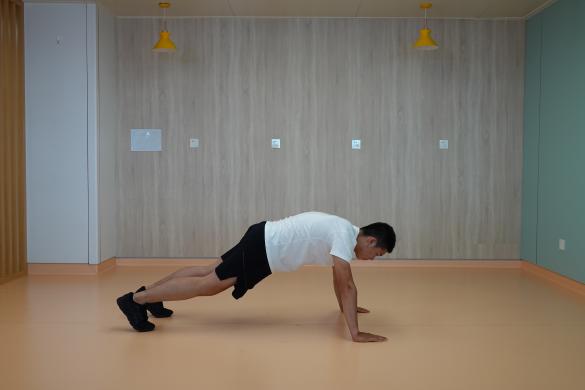 4、俯臥撐(窄撐):腰背挺直,雙腳腳尖及雙手撐地呈俯臥撐姿,雙手盡量靠攏,做窄距俯臥撐。10-12次為一組,做2-3組。