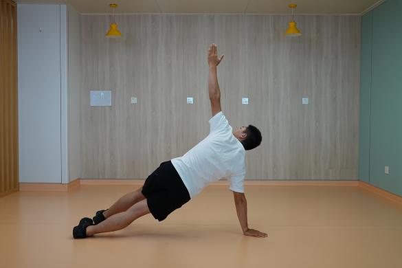 3、平板支撐(T位):腰背挺直,雙手與雙腳腳尖支撐身體做俯臥撐姿,單側(cè)手臂抬起并伴隨身體扭轉(zhuǎn)。交換對側(cè)重復,10-12次為一組,做2-3組。