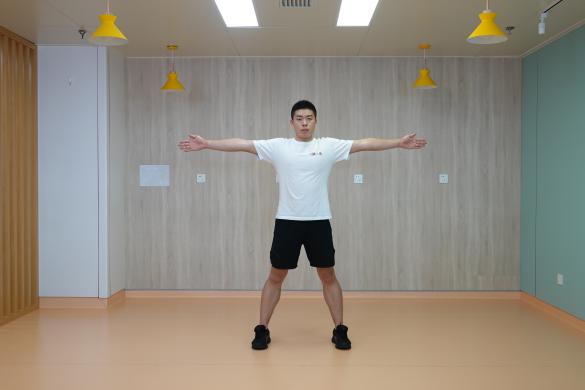 5、海豹開合跳:腰背挺直,雙腳并攏,手臂前平舉掌心向前,雙腳跳起并向外打開伴隨雙臂向上側(cè)平舉,掌心向前,再恢復起始位置。10-12次為一組,做2-3組。
