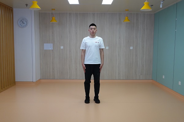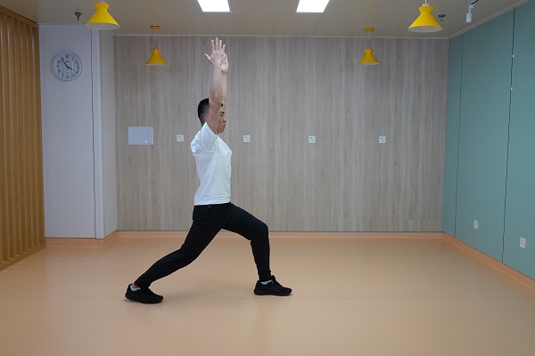 (2)戰士式:站姿,單腳后撤呈弓箭步并伴隨雙臂上舉,再回到站姿,左右交替為一次,一組進行10-12次,重復2-3組,組間休息60秒。