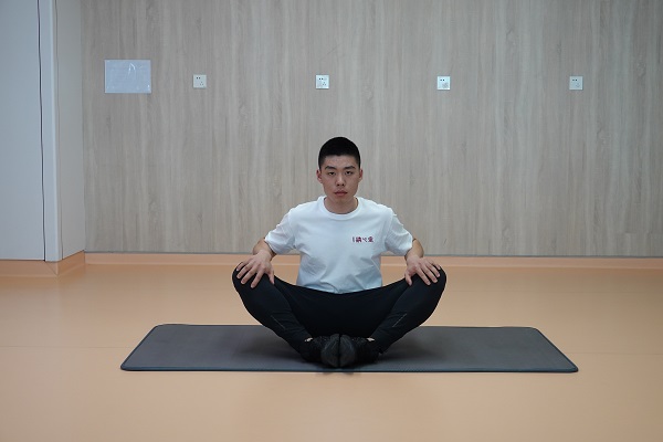 (4)蝴蝶式坐姿:坐在瑜伽墊上,雙腳腳心相對,軀干向下壓,保持3-5秒,進行3-5次為1組,重復2-3組,組間休息60秒。