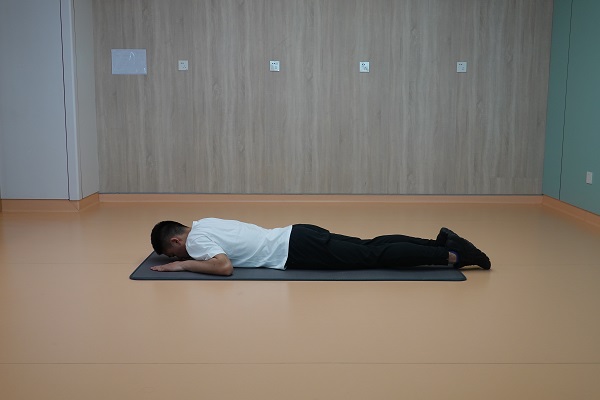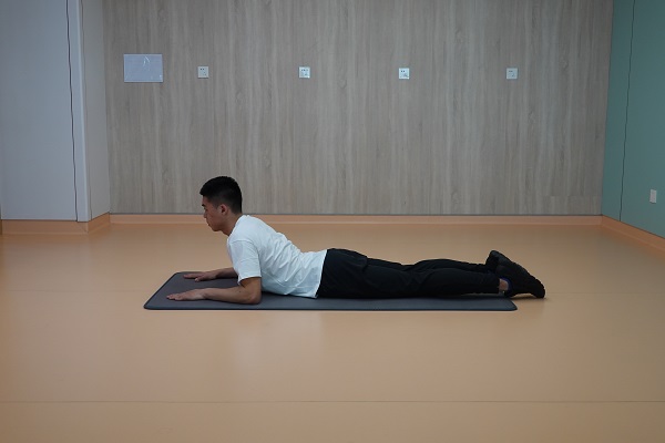 (5)眼鏡蛇式:俯臥在瑜伽墊上,雙手在胸部兩側,雙手將軀干支撐離地,保持3-5秒,進行3-5次為1組,重復2-3組,組間休息60秒。