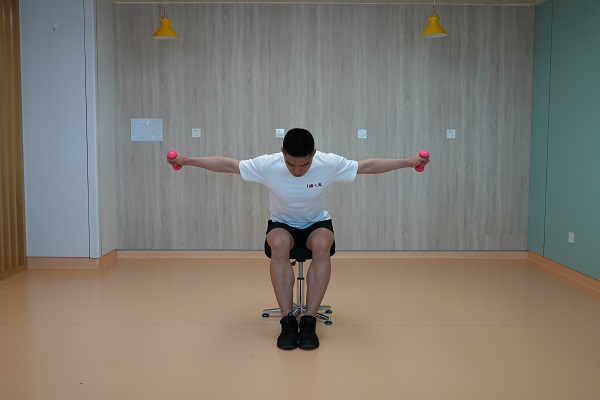 1、反向飛鳥(坐位):坐位,雙腳平放在地面上,雙臂放在兩側。背部挺直,腰部略微向前彎曲。保持手臂伸直,從側面舉起啞鈴,直到手臂與地面平行。再緩慢降到起始位置。10-12次為一組,做2-3組。