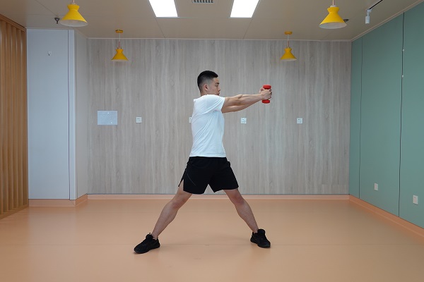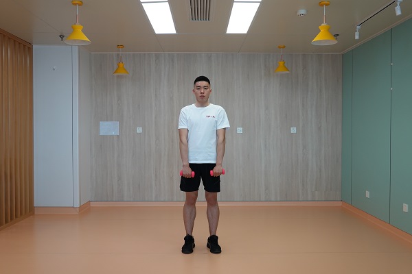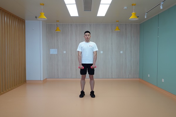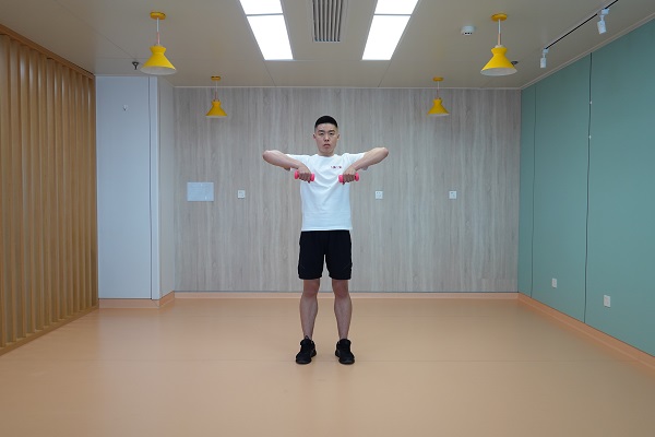 2、直臂上拉加轉向:雙腳開立與肩同寬,腰背挺直,雙手握啞鈴在身體前側,手心朝向身體,雙臂用力向上提拉至啞鈴與肩同高,手臂旋轉至肩關節外展90度,前臂與上臂呈90度姿勢,再緩慢回到起始位。10-12次為一組,做2-3組。