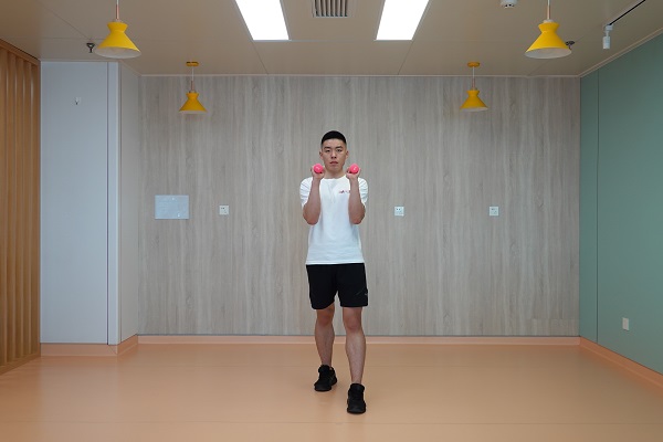 3、上拉負重深蹲:雙腳開立稍比肩寬,腰背挺直,雙手握啞鈴在身體前側,手心相對,向下下蹲至最低點后起身直立,雙臂提拉啞鈴至與肩同高,此時手心朝向身體。10-12次為一組,做2-3組。