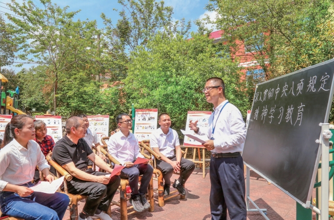 2025年4月18日,在福建省莆田市城廂區華亭鎮五云村,紀檢監察干部為黨員群眾細致解讀中央八項規定精神內涵及實踐要求。