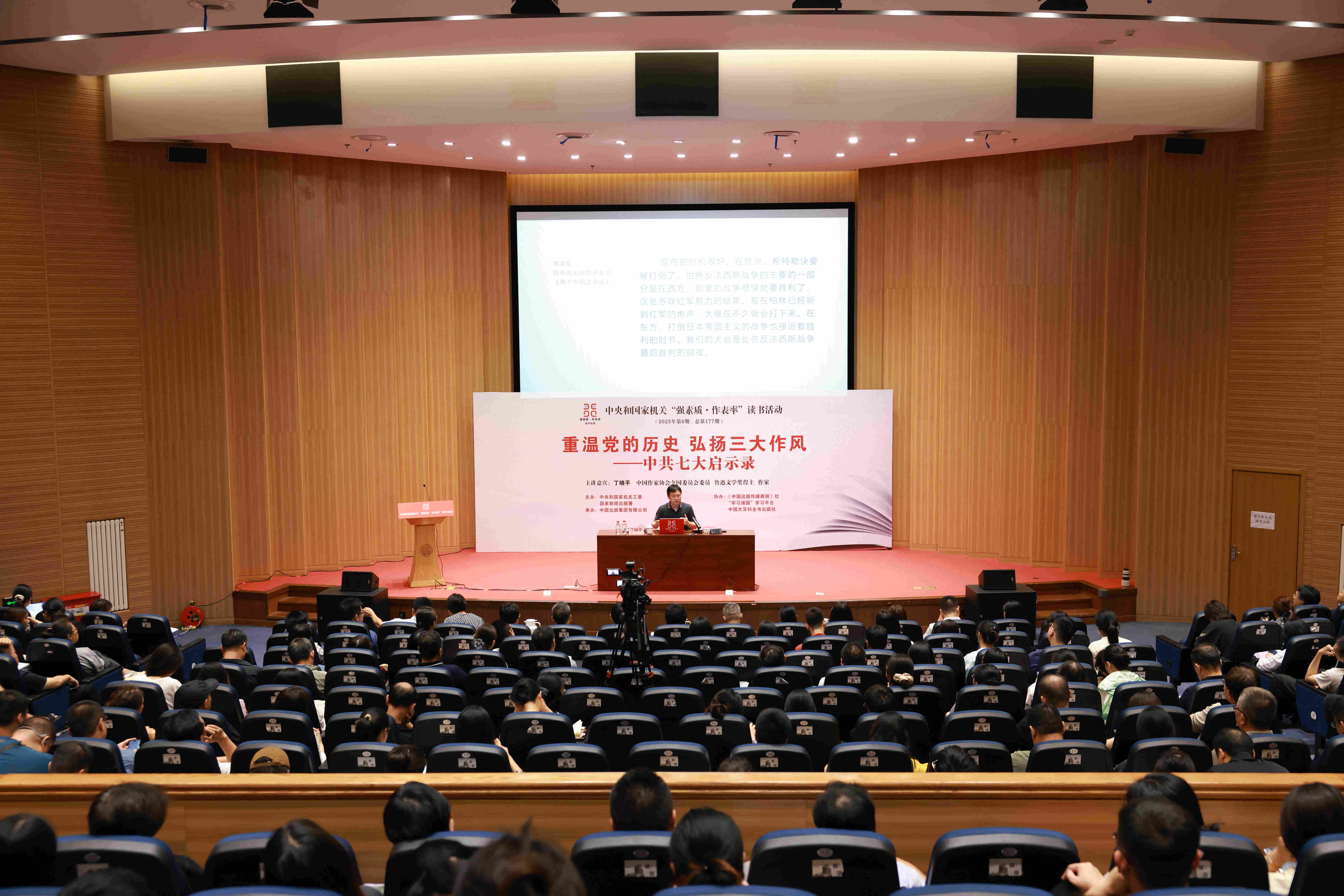 7月28日,中央和國(guó)家機(jī)關(guān)“強(qiáng)素質(zhì)·作表率”讀書活動(dòng)2025年第6期主題講座在京舉辦。中國(guó)作家協(xié)會(huì)全國(guó)委員會(huì)委員、魯迅文學(xué)獎(jiǎng)得主、作家丁曉平以《重溫黨的歷史 弘揚(yáng)三大作風(fēng)——中共七大啟示錄》為題作講座。中央和國(guó)家機(jī)關(guān)各部門黨員干部300余人參加。