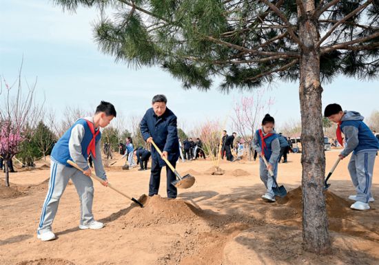 2025年4月3日,黨和國家領導人習近平、李強、趙樂際、王滬寧、蔡奇、丁薛祥、李希、韓正等來到北京市豐臺區永定河畔參加首都義務植樹活動。這是習近平同大家一起植樹。 新華社記者 謝環馳/攝