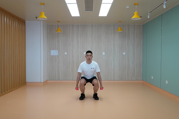 3、啞鈴深蹲:站姿,雙腳與肩同寬,雙手各持啞鈴置于體側,挺胸收腹。臀部向后下方坐,膝蓋隨之下彎曲(不超過腳尖),下蹲至大腿與地面平行,再起身回到起始位,感受臀腿肌群發力,下蹲階段用時3秒,站起階段用時2秒,一組進行10-15次,重復2-4組,組間休息60秒。