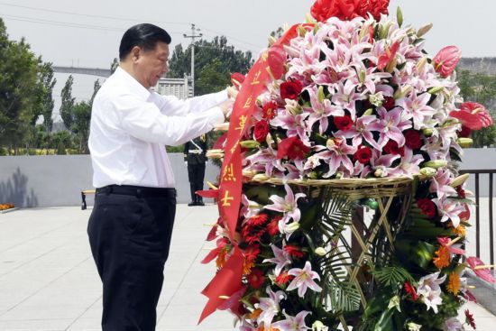 2017年6月21日,習近平總書記來到興縣,參觀晉綏邊區革命紀念館,向革命烈士敬獻花籃。新華社記者 李學仁 攝