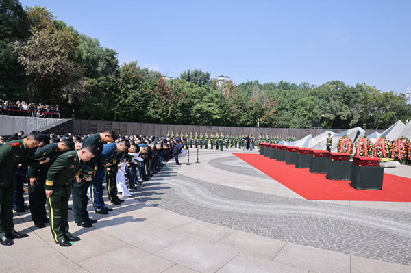 9月12日上午,沈陽桃仙國際機場碧空萬里,30位在韓中國人民志愿軍烈士英靈及267件遺物由我空軍運-20專機從韓國接回祖國。儀式現場莊嚴肅穆,中央和國家機關青年干部與抗美援朝老戰士、烈士親屬、部隊官兵、奧運健兒、勞動模范和青少年學生等1500余名各界代表列隊肅立,齊唱國歌,向烈士遺骸行三鞠躬禮,以此表達對先烈們的深切緬懷和無盡哀思。同日下午,青年代表赴抗美援朝烈士陵園祭掃,參觀“最可愛的人——抗美援朝英烈主題展”,聆聽退役軍人事務部烈士紀念設施保護中心青年紅色文化宣講隊現場講解,深入了解志愿軍英烈可歌可泣的戰斗故事。13日上午,第十二批在韓志愿軍烈士遺骸安葬儀式在沈陽抗美援朝烈士陵園舉行。中央和國家機關青年代表與現場全體人員排隊凝視禮送烈士棺槨,向烈士獻花致敬,并瞻仰烈士英名墻。