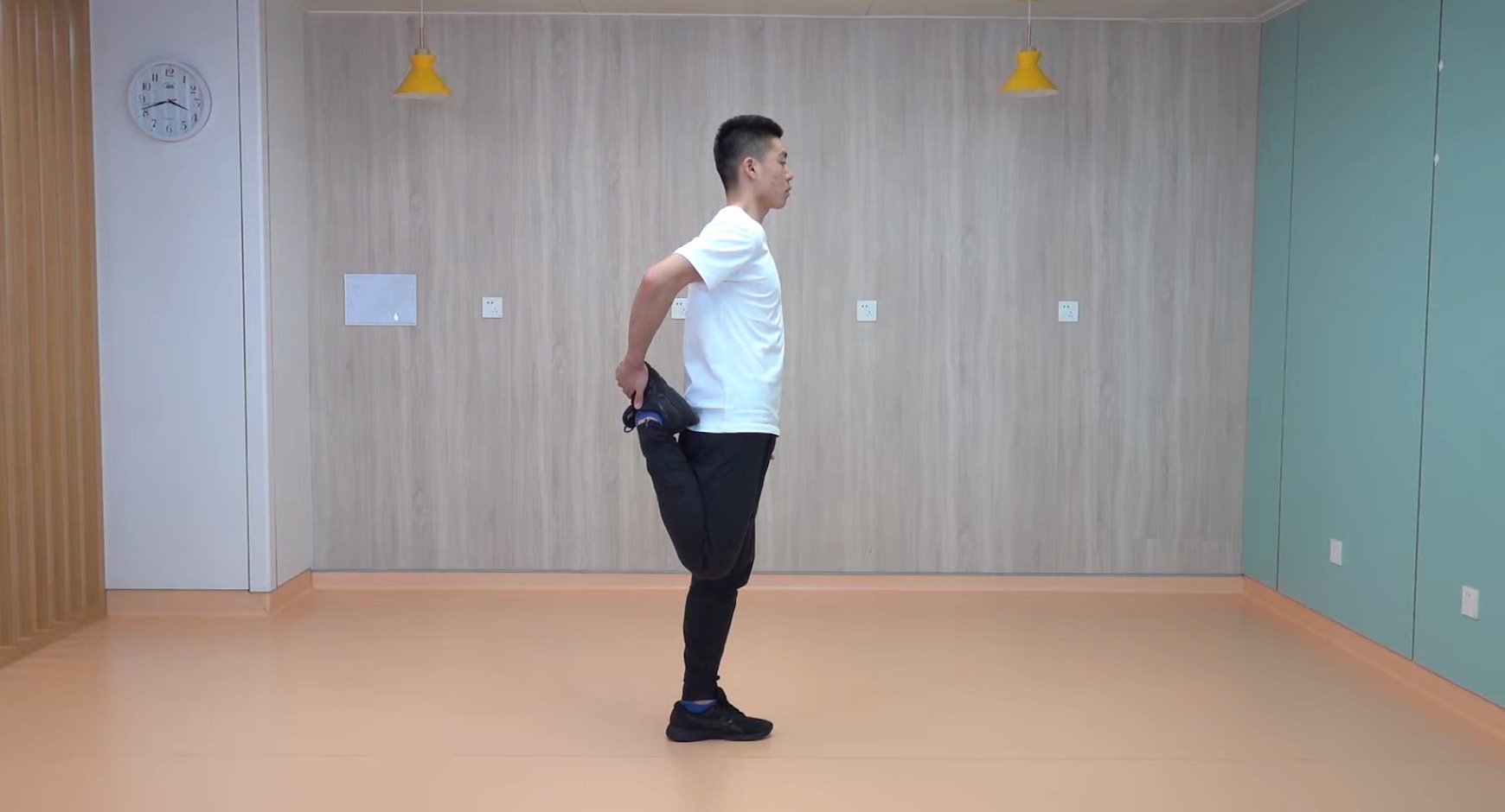 站式四頭肌:站姿,平衡不好者可扶墻,一手在身后抓住一側(cè)腳尖,大腿與地面垂直,保持3-5秒,單側(cè)進(jìn)行3-5次為1組,交換對(duì)側(cè),重復(fù)2-3組,組間休息60秒。