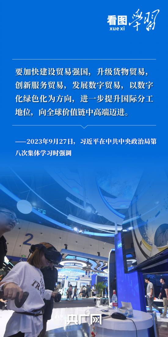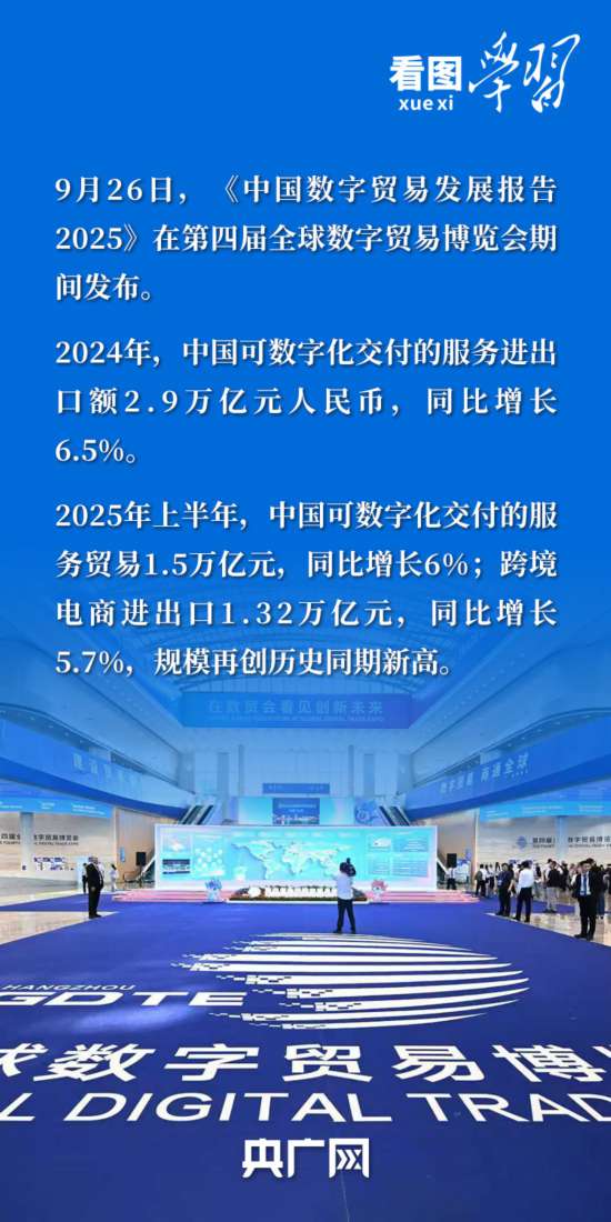 9月25日至29日,第四屆全球數字貿易博覽會在杭州大會展中心舉辦,發布百余項中國首發、亞洲首秀、全球首展技術產品,集中呈現生成式AI、多模態感官交互等尖端技術、產品。面向未來,我們要大力推動數字貿易改革創新發展,持續推進數字貿易制度型開放,打造建設貿易強國的“新引擎”。一起來學習!
