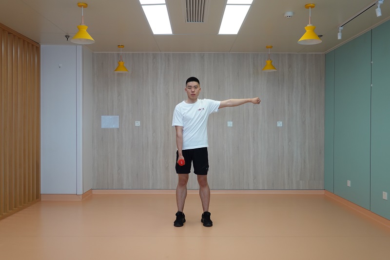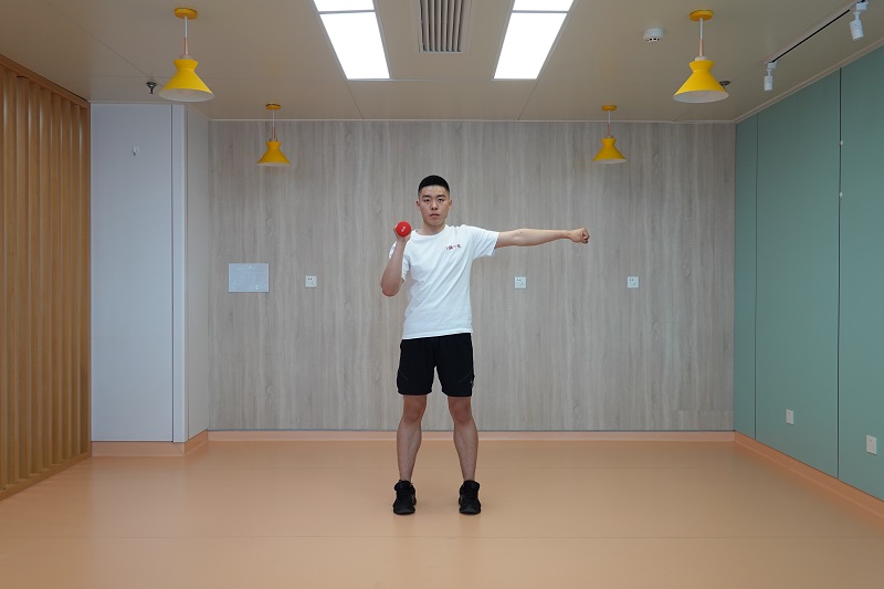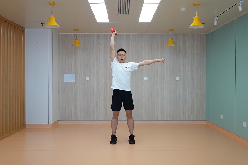 1、單臂提鈴加推舉:雙腳開立稍比肩寬,腰背挺直,單手握啞鈴,另一側手臂側平舉,向下下蹲到最低點后起身向上,同時啞鈴上舉至與肩同寬高度,并再次下蹲,再次起身后將啞鈴舉過頭頂。交換另一側繼續(xù)。10-12次為一組,做2-3組。