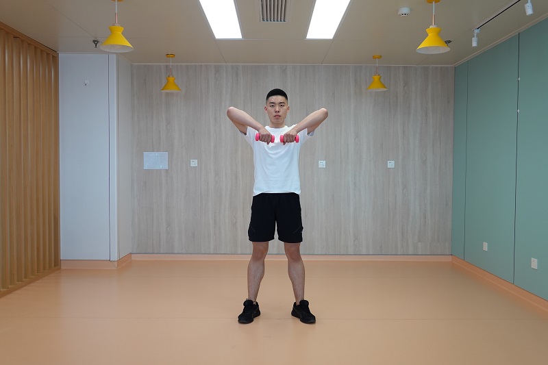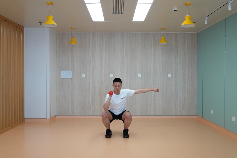 2、上拉負重深蹲:雙腳開立稍比肩寬,腰背挺直,雙手握啞鈴在身體前側,手心相對,向下下蹲至最低點后起身直立,雙臂提拉啞鈴至與肩同高,此時手心朝向身體。10-12次為一組,做2-3組。