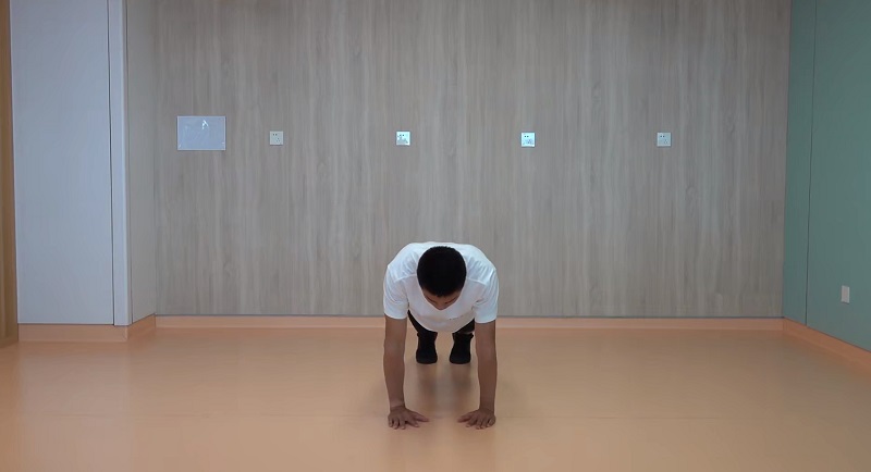 3、俯臥撐(窄撐):腰背挺直,雙腳腳尖及雙手撐地呈俯臥撐姿,雙手盡量靠攏,做窄距俯臥撐。10-12次為一組,做2-3組。