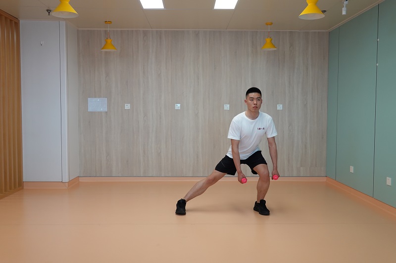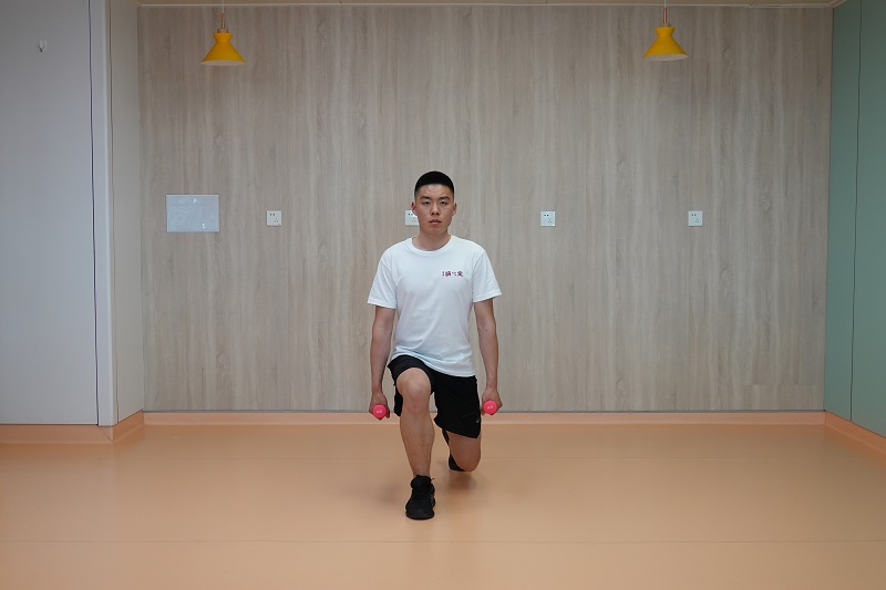 4、多方向箭步蹲:腰背挺直,雙腳開立與肩同寬,雙手握啞鈴于身體兩側,一側腿向前邁出一步做前箭步蹲,起身還原后,向側方邁出一步做側箭步蹲,起身還原后,再向后邁步做后箭步蹲。交換對側重復。10-12次為一組,做2-3組。