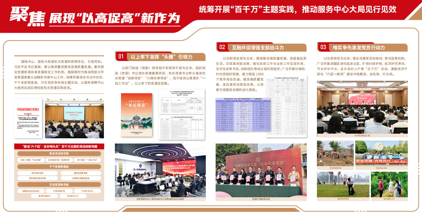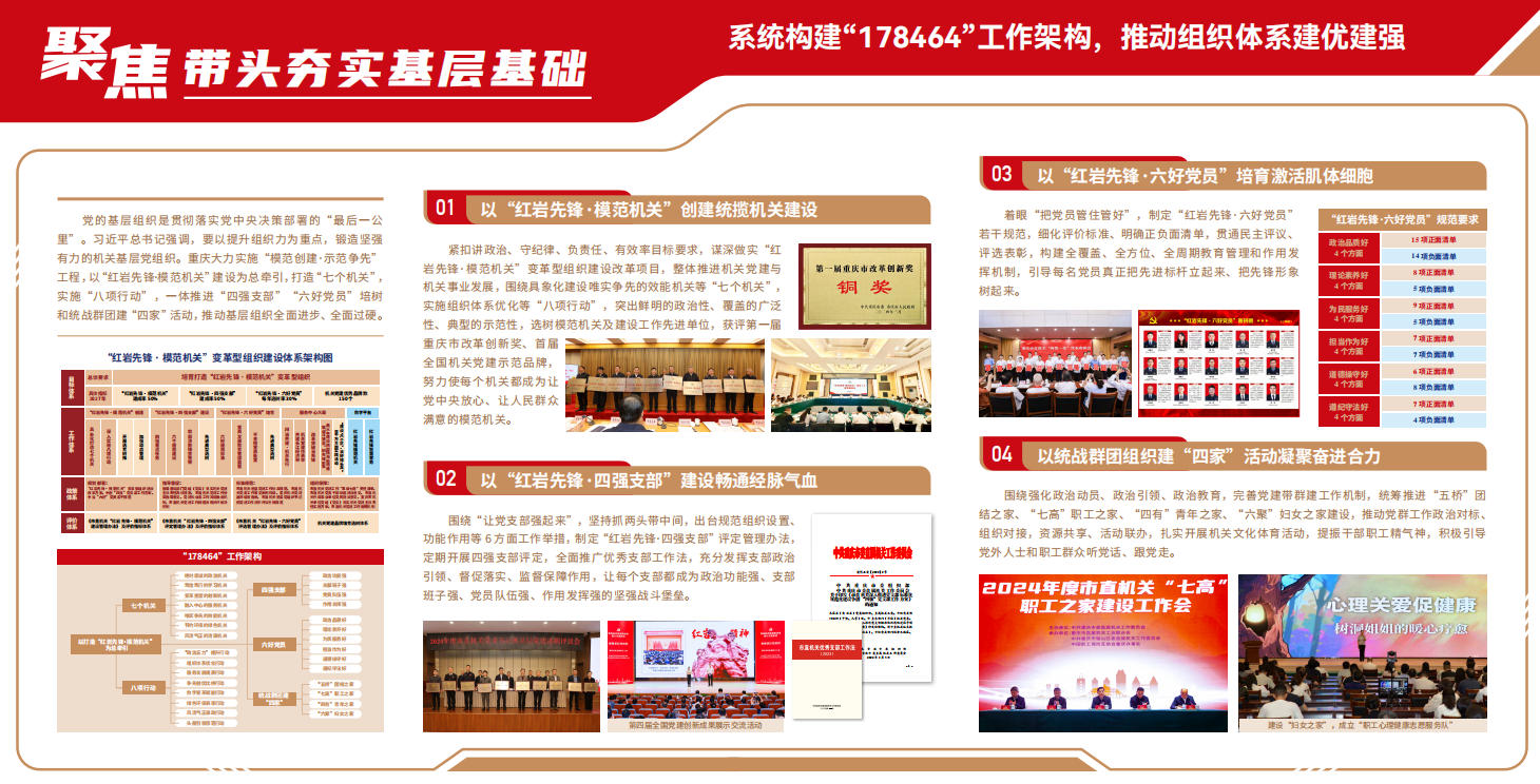 黨的十八大以來,習近平總書記高度重視機關黨的建設,多次發表重要講話、作出重要指示,科學回答了機關黨的建設為什么抓、抓什么、怎么抓、誰來抓等一系列重大理論和實踐問題,為推動機關黨建高質量發展指明了前進方向、提供了根本遵循。重慶市直機關各級黨組織和黨員干部一體學習、一體貫徹習近平總書記關于機關黨建和視察重慶重要講話重要指示精神,突出市委示范引領與基層組織上下聯動、市直機關與區縣部門同頻共振、機關黨建與中心大局深度融合、改革創新與數字賦能提質增效、壓實主責與齊抓共管全面發力,以堅持做到“四個帶頭”、全面提高機關黨建質量、當好“三個表率”、建設模范機關為總目標,圍繞加快建設新時代“紅巖先鋒”變革型組織、聚力打造新時代市域黨建新高地機關樣板,從目標體系、工作體系、政策體系、評價體系上進行系統部署,從分類指導、清單管理、項目實施、閉環落實上抓好具象落地,以高質量機關黨建促進高質量發展,形成一批具有重慶辨識度、全國影響力的標志性成果,為現代化新重慶建設提供了堅強保證。