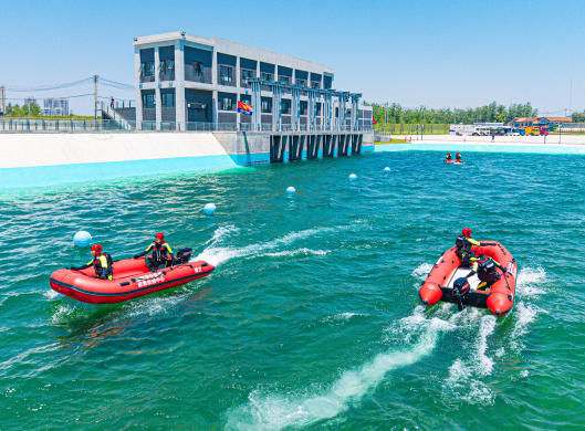 2025年5月11日,應急救援人員在“十四五”期間建成的華中區域應急救援中心激流救援訓練場開展舟艇救援協同訓練。